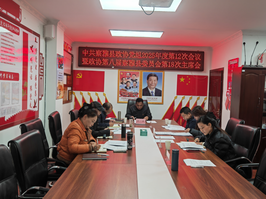 2025年12月15日上午,县政协党组书记、主席多登主持召开中共察雅县政协党组2025年度第十二次会议暨政协第八届察雅县委员会第18次主席会议。在家班子成员参加了会议,机关党员干部列席会议。会议集中学习了中央、自治区、市、县近期重要会议与文件精神,重点围绕学习贯彻自治区党委十届九次全会精神、加...