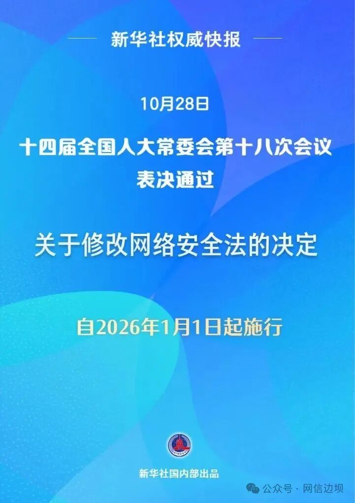 十四届全国人大常委会第十八次会议10月28日表决通过关于修改网络安全法的决定,自2026年1月1日起施行。