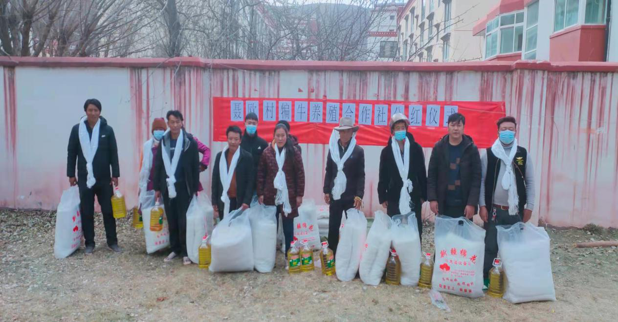 2021年1月6日,烟多镇聂欧村犏奶牛养殖农民专业合作社举行2020年度分红物资发放仪式,为20户群众(其中建档立卡户15户)分红,共发放清油20桶、被子20条,折合现金约3500元,户均分红约175元。