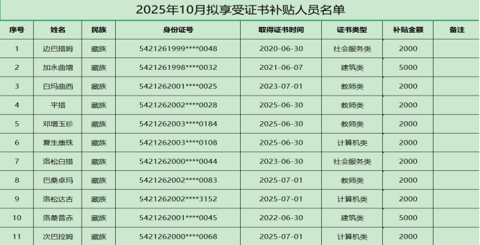 根据《西藏自治区就业资金实施细则》的通知(藏人社发〔2020〕68号)及《关于印发<西藏自治区高校毕业生市场就业创业补贴实施细则>的通知》(藏人社发〔2025〕9号)文件规定,经察雅县人社局就业创业服务中心审核,现将察雅县2025年10月拟享受高校毕业生证书补贴人员名单进行公示,如有异议,请向察雅县人社局就业创业服务中心反映。