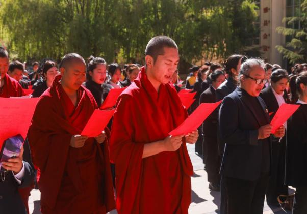 在百人经典集体诵读环节,全体参会人员精神饱满、列队整齐,齐声诵读经典篇目。琅琅书声雄浑有力、萦绕全场,庄重浓厚的氛围极具感染力。大家在诵读中感悟经典智慧、涵养家国情怀,凝聚起共建美好察雅的强大精神动力,进一步提升了活动的文化内涵与实效。